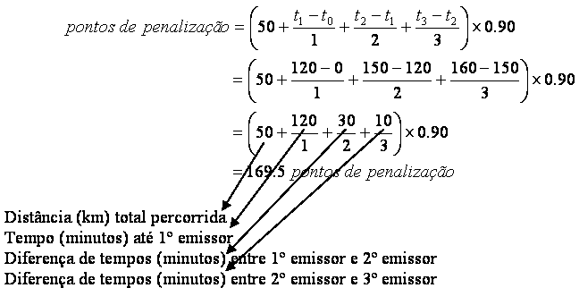 Uma prova com 3 emissores (N = 3) e uma equipa com 1 elemento (bonificação = 0.90), admite-se que desde o inicio da prova até descobrir o último emissor, percorreu 50 km, e considerando que iniciou a prova às 14h30 (inicio dos tempos às 14h30, então t0 (tempo do “cronómetro” do inicio da prova) é t0 = 0 min; descobriu o primeiro emissor às 16h30 (t1 = 2h = 120 min), o segundo emissor às 17h00 (t2 = 2h30 = 150 min) e o terceiro (último) emissor às 17h10 (t3 = 2h40 = 160 min), a sua penalização em pontos, é: